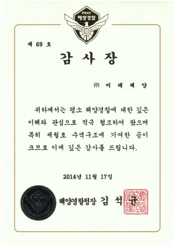¼¼¿ùÈ£ ¼ö»ö±¸Á¶ Âü¿© ÇØ¾ç°æÂûû °¨»çÀå ¼ö»ó